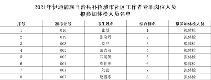按照《2021年伊通满族自治县补招城市社区工作者专职岗位人员拟参加面试人员公告》有关要求,根据考生总成绩排序从高分到低分按照1:1比例确定拟参加体检人选。现通知如下: