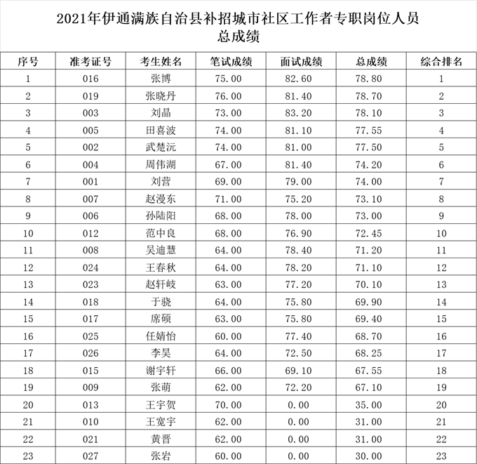 附件:《2021年伊通满族自治县补招城市社区工作者专职岗位人员总成绩》