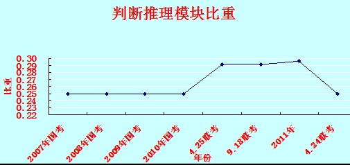 从上图可以分析出:判断推理模块在2010年的考试中有所上升,从以前的0.25上升到0.3,虽然刚刚不久的424联考中考察比重又回到0.25,但是比重上升的趋势不可忽视。